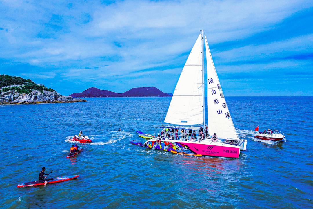 东旦时尚运动海滩则主打原生态运动体验,海上摩托艇的风驰电掣、桨板竞速的默契配合,还有沙滩飞盘的随性畅玩,让海风成为最好的运动搭档。